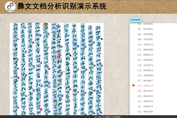 此外,團隊還開發(fā)了彝文文檔分析識別系統(tǒng),能自動精確定位并辨識圖片中的彝文文字(以自定義編碼給出輸出)。這項識別技術(shù)采用的彝文編碼基于團隊今年早前與上海大學(xué)、上海合合信息科技公司聯(lián)合發(fā)布的業(yè)界首個古彝文基礎(chǔ)編碼數(shù)據(jù)庫。