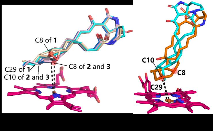 為了揭開P450酶IkaD和CftA催化功能差異的神秘面紗,研究團隊首先解析了IkaD和CftA與共同底物1的復合結構。發(fā)現(xiàn)二者的整體三維骨架基本重合,是典型的金字塔形P450骨架,但參與構成催化口袋的FG區(qū)域的構象明顯不同,從而影響了催化口袋的形狀(圖1),使得同一個底物1朝向兩個酶血紅素鐵反應中心的距離和角度不同(圖2),最終決定了酶催化反應的區(qū)域和化學選擇性?;谶@一發(fā)現(xiàn),研究團隊通過理性設計,對遠離血紅素鐵反應中心的極性氨基酸開展單點突變,發(fā)現(xiàn)IkaD的部分突變酶能夠改變催化反應的區(qū)域選擇性,形成天然分離未發(fā)現(xiàn)過的人工新產(chǎn)物。