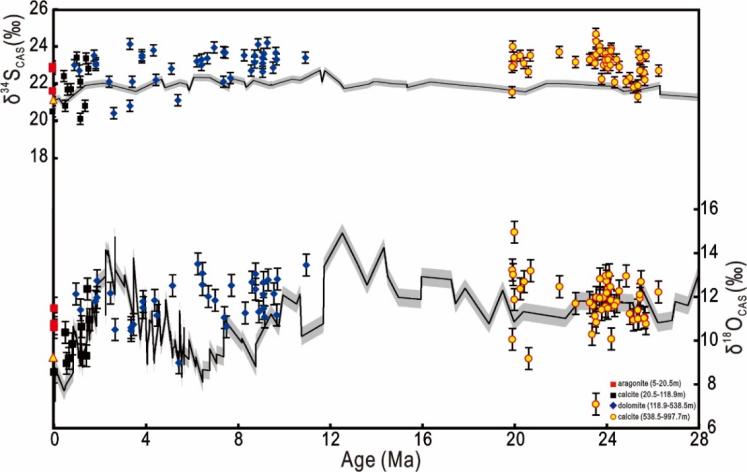 通過(guò)對(duì)礁碳酸鹽巖中CAS含量及其同位素比值的測(cè)定,研究人員發(fā)現(xiàn)礁碳酸鹽受大氣和海洋成巖作用及白云石化作用的影響。在大氣和海洋成巖作用過(guò)程中,CAS含量迅速下降,當(dāng)長(zhǎng)期暴露于地面,其含量降到最低水平。另外,相較于同期重晶石的20.9 ~ 22.7‰的δ34SCAS值,礁碳酸鹽的含量相對(duì)較低,但其δ34SCAS值保持在21.5 ~ 24.1‰的狹窄范圍內(nèi)波動(dòng)。這一現(xiàn)象表明原始的δ34SCAS值得以完好保存下來(lái),基本不受重結(jié)晶過(guò)程的影響。研究還發(fā)現(xiàn),與硫同位素相比,氧同位素更容易受到成巖作用的影響。