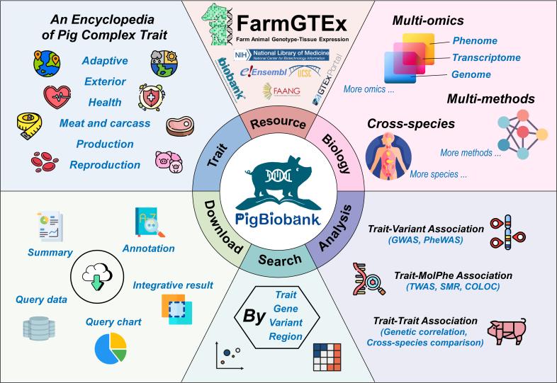 精準(zhǔn)解析豬復(fù)雜性狀對(duì)了解動(dòng)物復(fù)雜性狀遺傳調(diào)控機(jī)制和提高豬群生產(chǎn)性能意義重大。然而,當(dāng)前以豬復(fù)雜性狀為核心的綜合性數(shù)據(jù)庫(kù)匱乏,極大地限制了不同領(lǐng)域科學(xué)家對(duì)豬復(fù)雜性狀遺傳機(jī)制的深入探索。為幫助更多領(lǐng)域科學(xué)家精準(zhǔn)解析豬復(fù)雜性狀,作為FarmGTEx國(guó)際畜禽動(dòng)物研究計(jì)劃PigGTEx聯(lián)盟的系列工作之一, PigBiobank收集了來自全球71, 885頭豬的264個(gè)復(fù)雜性狀全基因組關(guān)聯(lián)分析(GWAS)結(jié)果、PigGTEx項(xiàng)目產(chǎn)生的豬34個(gè)組織5類分子數(shù)量基因座(molQTLs)結(jié)果、Ensembl等多種來源的豬多組學(xué)數(shù)據(jù)以及UKB等跨物種復(fù)雜性狀數(shù)據(jù),并對(duì)這些大數(shù)據(jù)資源進(jìn)行統(tǒng)一的整合分析和可視化,進(jìn)而形成了以豬復(fù)雜性狀為核心的綜合性數(shù)據(jù)庫(kù) PigBiobank (http://pigbiobank.farmgtex.org/)。