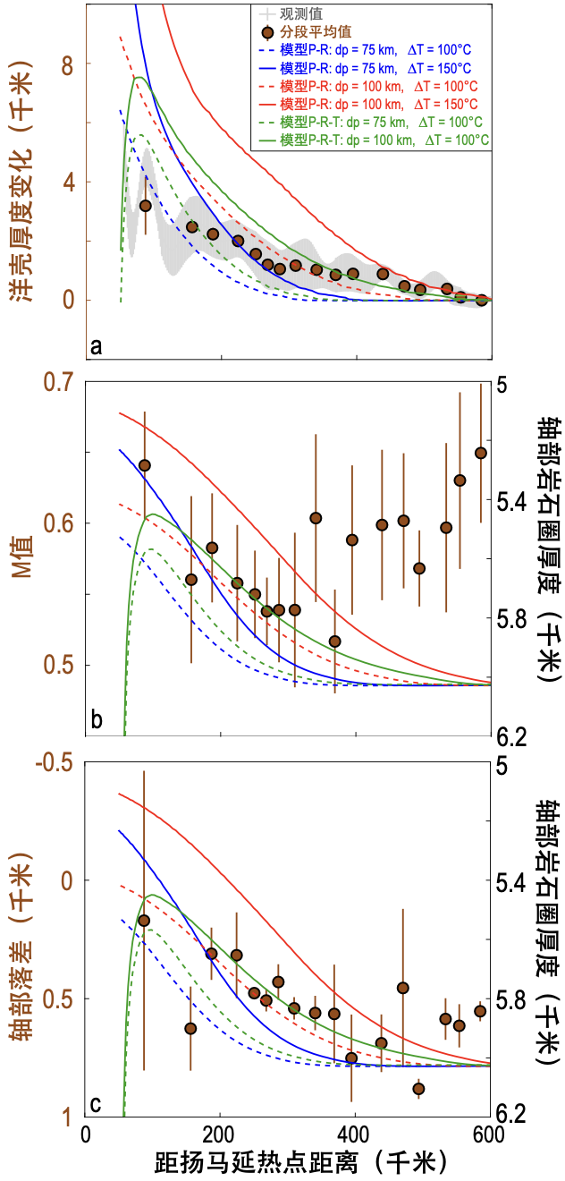 利用基于有限元的地球動(dòng)力學(xué)模擬軟件ASPECT,研究人員建立了熱點(diǎn)-洋中脊、熱點(diǎn)-洋中脊-轉(zhuǎn)換斷層相互作用的三維地球動(dòng)力學(xué)模型,并通過將模型結(jié)果與觀測(cè)數(shù)據(jù)進(jìn)行對(duì)比,估算了揚(yáng)馬延熱點(diǎn)的規(guī)模(熱點(diǎn)直徑、溫度異常及浮力通量)。