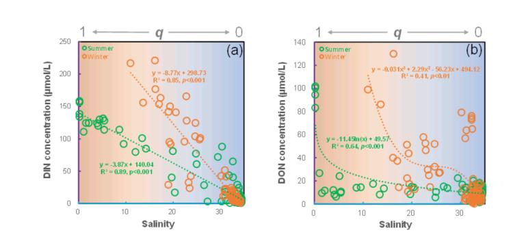 圖2 .珠江口海域有機(jī)氮的分布模式。(a)DIN和(b)DON沿鹽度梯度的季節(jié)性分布趨勢。(綠色圓圈代表夏季的營養(yǎng)物質(zhì)濃度,橙色圓圈代表冬季)