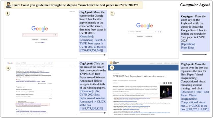 CogAgent 模型同時(shí)接受當(dāng)前 GUI 截圖(圖像形式)和用戶操作目標(biāo)(文本形式,例如“search for the best paper in CVPR 2023”)作為輸入,就能預(yù)測(cè)詳細(xì)的動(dòng)作,和對(duì)應(yīng)操作元素的位置坐標(biāo)??梢詰?yīng)用于包括電腦、手機(jī)的各種場(chǎng)景。受益于 GUI Agent 的可泛化性,CogAgent 能在各類沒見過的場(chǎng)景與任務(wù)上都取得良好的性能。論文中展示了更多示例,覆蓋了 PPT、手機(jī)系統(tǒng)、社交軟件、游戲等各類場(chǎng)景