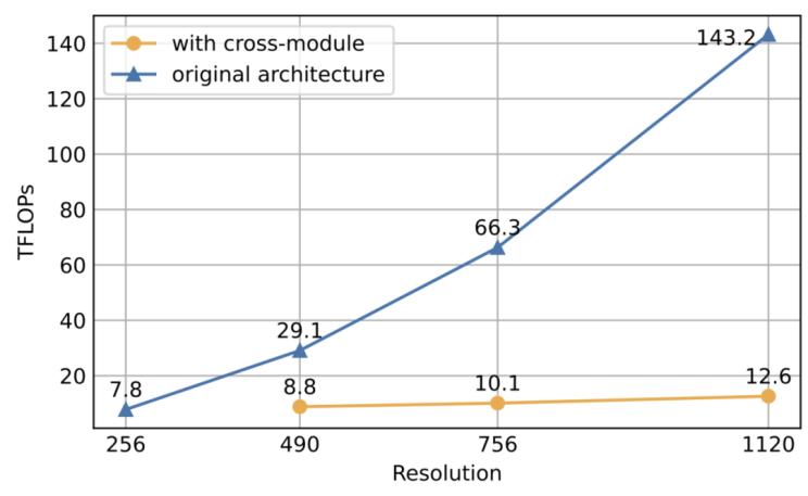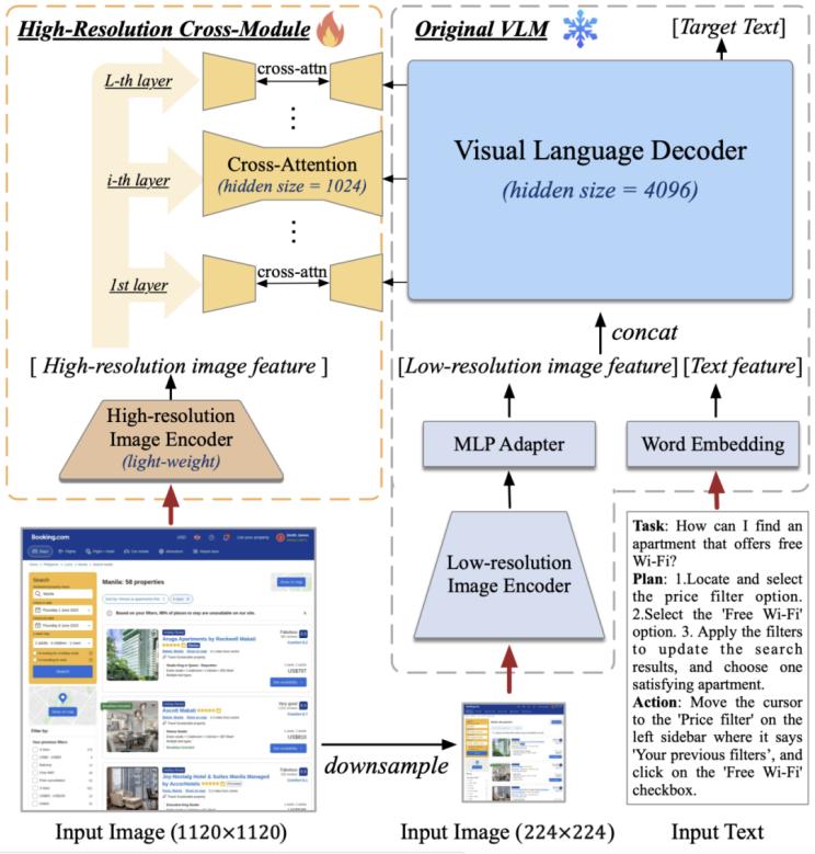 對(duì)此,團(tuán)隊(duì)設(shè)計(jì)了輕量級(jí)的“高分辨率交叉注意力模塊”,在原有低分辨率大圖像編碼器(4.4 B)的基礎(chǔ)上,增加了高分辨率的小圖像編碼器 (0.3 B),并使用交叉注意力機(jī)制與原有的 VLM 交互。在交叉注意力中,團(tuán)隊(duì)也使用了較小的 hidden size,從而進(jìn)一步降低顯存與計(jì)算開銷。