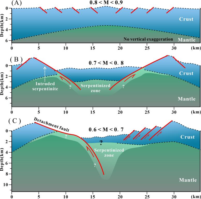 與主要集中在大洋的研究不同,研究發(fā)現(xiàn)南海在中速(M值平均約為0.88)和慢速(M值平均約為0.78)擴(kuò)張階段,顯示出較同擴(kuò)張速率大洋更多的巖漿供應(yīng)量。在早期形成的西北和東部次海盆,M值主要集中在0.8-1之間,而在晚期的東部次海盆和西南次海盆,M值在0.5-0.8和0.8-1兩個(gè)區(qū)間內(nèi)交替變化。