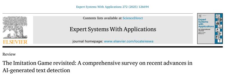近日,團隊的論文“The Imitation Game revisited: A comprehensive survey on recent advances in AI-generated text detection ”被中科院一區(qū)TOP期刊 《Expert Systems with Applications》錄用發(fā)表,JCR分區(qū)Q1,最新SCI影響因子為7.5。