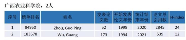 內(nèi)地農(nóng)業(yè)類科研機(jī)構(gòu)中上榜的科學(xué)家按榜單排名和H指數(shù)的具體情況如表1和表2所示: