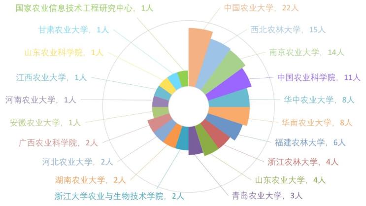 其中,中國(guó)農(nóng)業(yè)大學(xué)上榜人數(shù)最多,有22人,西北農(nóng)林大學(xué)次之,人數(shù)有15人,南京農(nóng)業(yè)大學(xué)上榜人數(shù)排第三,有14人。