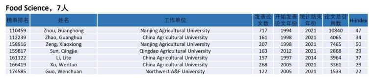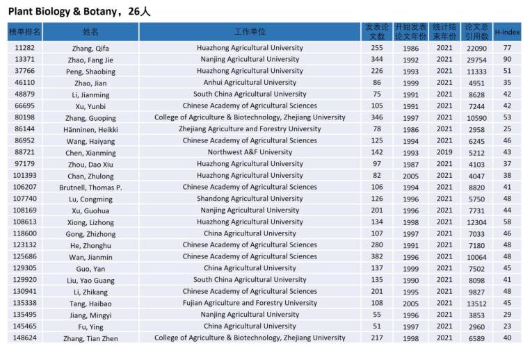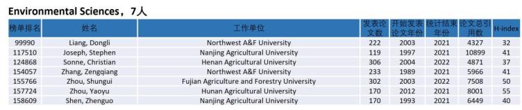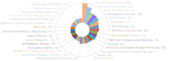 其中排名第一的是Plant Biology & Botany領(lǐng)域,有26人,排名第二的是Agronomy & Agriculture領(lǐng)域,有16人,并列排名第三的是Analytical Chemistry,Environmental Sciences以及Food Science領(lǐng)域,各有7人。