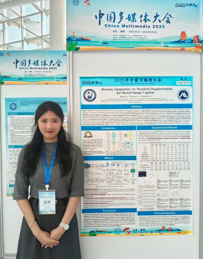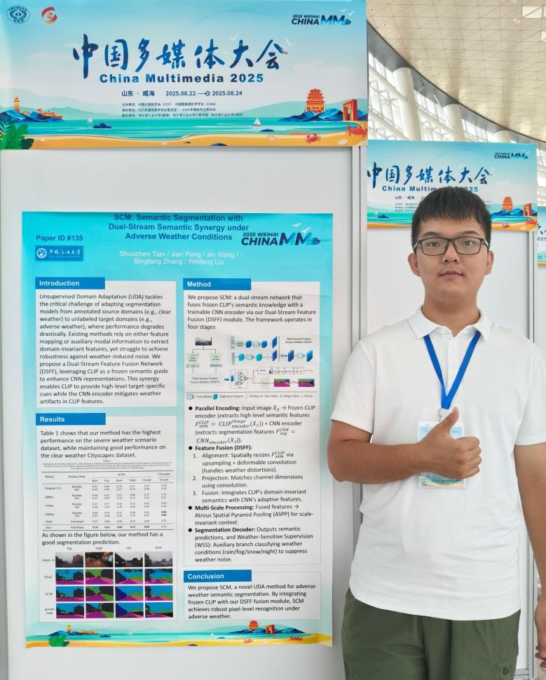 團(tuán)隊(duì)兩篇論文被接收,教師劉寶弟、李天寶、韓沛秀,博士生于浩然,碩士生呂萌、田朔塵參加此次會(huì)議。會(huì)上,呂萌、田朔塵分別展示了其在無標(biāo)簽跨域草圖描述及惡劣天氣場(chǎng)景語義分割的研究工作。其中,《Domain Adaptation via Manifold Regularization for Sketch Image Caption》提出了一種針對(duì)跨域草圖描述任務(wù)的無監(jiān)督領(lǐng)域自適應(yīng)框架。通過引入流形正則化約束及動(dòng)態(tài)更新的自適應(yīng)權(quán)重,有效緩解了自然圖像與草圖圖像的顯著特征分布差異,實(shí)現(xiàn)了無配對(duì)標(biāo)注數(shù)據(jù)的草圖語義生成?!禨CM: Semantic Segmentation with Dual-Stream Semantic Synergy under Adverse Weather Conditions》提出了一種在惡劣天氣條件下進(jìn)行跨域語義分割的方法。通過DSFF融合域不變特征和分割特征,模型更好地適應(yīng)惡劣天氣條件下的語義分割任務(wù),取得了良好的實(shí)驗(yàn)效果。
