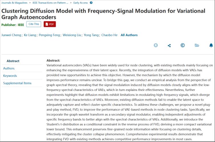 近日,研究組23級博士研究生程俊偉作為第1作者在人工智能領(lǐng)域頂級期刊IEEE Transactions on Pattern Analysis and Machine Intelligence(TPAMI)發(fā)表題為“Clustering diffusion model with frequency-signal modulation for variational graph autoencoders”的學術(shù)論文。至此,GraphAI4IE研究組成立三年來,已在TPAMI、TKDE、Information Fusion、AAAI、SIGIR、WWW、MM、 CIKM、UAI、DASFAA等CCF A、B類、Trans類、中科院1-2區(qū)、計算領(lǐng)域高質(zhì)量科技期刊T1類發(fā)表高層次論文30余篇。