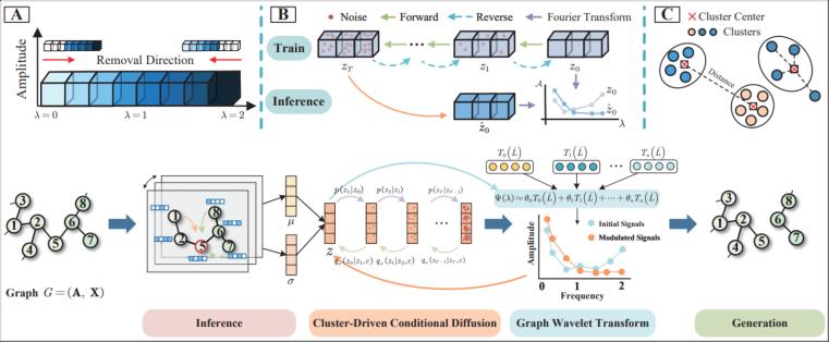 該論文聚焦于圖聚類(社區(qū)發(fā)現(xiàn))任務中的變分自編碼器模型優(yōu)化問題,創(chuàng)新性地引入頻域信號調(diào)制機制,為變分圖自編碼器與去噪擴散模型的結(jié)合開辟了新的視角。在圖機器學習領(lǐng)域,變分圖自編碼器(VGAE)被廣泛應用于社區(qū)發(fā)現(xiàn)等任務,去噪擴散概率模型(DDPM)因其強大的生成能力被引入VGAE以增強其聚類效果。然而,DDPM擴散機制在頻譜層面與VGAE對信號的偏好存在沖突。研究發(fā)現(xiàn),VGAE傾向于保留低頻信號而抑制高頻信號,而原始 DDPM卻會“全頻放大”信號且難以準確表征潛在聚簇信息,進而導致頻譜錯配與簇結(jié)構(gòu)退化等問題。為此,該論文設計了一種頻域調(diào)制擴散模塊,其主要特性包括:(1)基于小波變換的譜域調(diào)控。借助圖小波變換增強低頻、抑制高頻,使擴散輸出更符合VGAE的頻譜偏好;(2)簇驅(qū)動的條件擴散。引入Student-t分布建模簇結(jié)構(gòu),引導擴散過程學習并保留社區(qū)邊界信息;(3)插件式設計:可無縫集成至VGAE主流框架,具備良好的通用性與遷移能力。