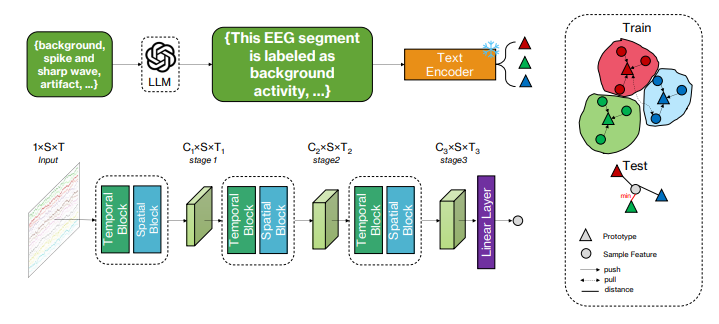 SemSTNet的核心創(chuàng)新在于引入了一種語義度量學(xué)習(xí)范式,利用預(yù)訓(xùn)練語言模型生成類別原型,從而更好地捕捉不同腦電類別之間的語義關(guān)系,增強(qiáng)同類樣本的緊湊性。這些原型在訓(xùn)練前離線生成,無需在部署時(shí)調(diào)用語言模型,極大降低了計(jì)算開銷。