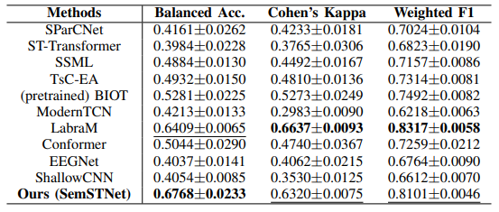 此外,SemSTNet采用輕量級卷積架構(gòu),分別處理腦電信號的時(shí)空特征,模型參數(shù)量僅為23K,比主流基于Transformer的模型減少超過100倍。盡管模型較小,其在癲癇事件分類和睡眠分期等任務(wù)上的表現(xiàn)卻顯著優(yōu)于多個(gè)現(xiàn)有先進(jìn)模型,包括預(yù)訓(xùn)練的大規(guī)模Transformer模型。