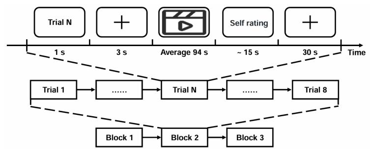 每個(gè)試次之間設(shè)置30秒休息時(shí)間,每個(gè)組塊持續(xù)約20分鐘。在每個(gè)組塊中,8個(gè)刺激材料包括2個(gè)正性視頻、2個(gè)負(fù)性視頻和4個(gè)中性視頻。正性與負(fù)性情緒視頻與中性視頻交替呈現(xiàn)。由于有些患者處于治療時(shí)期,不宜接觸情緒價(jià)偏低的視頻,并非所有受試者完成了三個(gè)組塊的實(shí)驗(yàn)。
