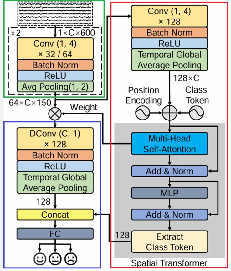 2. 全局空間特征提取器:在輸入空間Transformer之前,Xt首先經(jīng)過一個(gè)卷積模塊。該模塊旨在提取全局時(shí)間特征,同時(shí)保留通道之間的依賴關(guān)系。其結(jié)構(gòu)包括一個(gè)卷積層、一個(gè)BN層、一個(gè)ReLU激活函數(shù)層以及在時(shí)間維度上的全局平均池化層。該模塊的卷積層計(jì)算過程記為Conv3(:),其余操作記為γ(:)。此外,還在特征圖中加入一個(gè)可學(xué)習(xí)向量xl,用于與每個(gè)通道向量計(jì)算相關(guān)性。同時(shí),添加一個(gè)可學(xué)習(xí)的位置向量Xpos到特征圖中,以保留各通道的相對(duì)位置信息。上述過程可表示為: