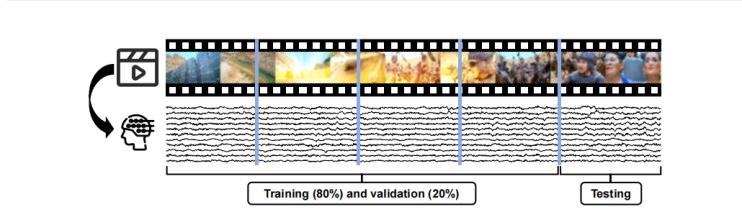 本研究中數(shù)據(jù)集采用留一分段交叉驗(yàn)證進(jìn)行構(gòu)建,即將受試者觀看每個(gè)視頻時(shí)采集的SEEG 數(shù)據(jù)按照時(shí)間順序劃分為五組,每組數(shù)據(jù)用作一次測(cè)試集,其余四組數(shù)據(jù)作為訓(xùn)練集。此外,隨機(jī)選取訓(xùn)練集數(shù)據(jù)的20%作為驗(yàn)證集。該過程重復(fù)五次,以確保每組數(shù)據(jù)都被用作一次測(cè)試集。
