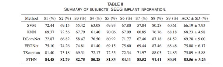九名受試者的SEEG信號(hào)基線模型和所提出的STHN模型性能對(duì)比如表1所示。總體來(lái)看,深度學(xué)習(xí)算法在情緒識(shí)別中的準(zhǔn)確率高于機(jī)器學(xué)習(xí)算法。STHN在情緒識(shí)別準(zhǔn)確率方面優(yōu)于所有基線模型。此外,STHN在所有受試者上的準(zhǔn)確率均超過80%,其中在受試者S8上更是超過90%。同時(shí),STHN的標(biāo)準(zhǔn)差最低,表明其在跨受試者的情緒識(shí)別中具有更高的穩(wěn)定性。