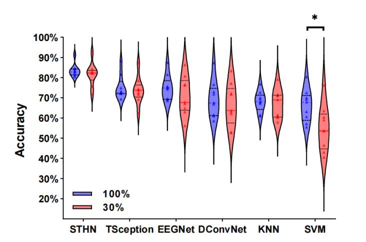 圖4展示了受試者S1的電極植入情況,權(quán)重大于0.6的觸點(diǎn)顯示為紅色。“L”代表左側(cè),“A”代表前側(cè),“R”代表右側(cè)。可見SEEG通道呈稀疏性,只有少數(shù)通道權(quán)重較高。為驗(yàn)證高權(quán)重通道的有效性,本文以10%為間隔,選取各受試者權(quán)重排名前10%至100%的通道作為輸入進(jìn)行實(shí)驗(yàn),并采用Wilcoxon符號(hào)秩檢驗(yàn)。結(jié)果(圖5)表明,當(dāng)通道比例從前10%增至30%時(shí)性能顯著提升,而超過30%后不再顯著增加。進(jìn)一步驗(yàn)證(圖6)顯示,除SVM外,其余對(duì)比模型在僅使用前30%通道時(shí)與使用全部通道相比準(zhǔn)確率無(wú)顯著差異,說(shuō)明STHN篩選的前30%通道具有代表性與有效性。圖5和圖6中*代表結(jié)果在95%的置信區(qū)間下顯著。