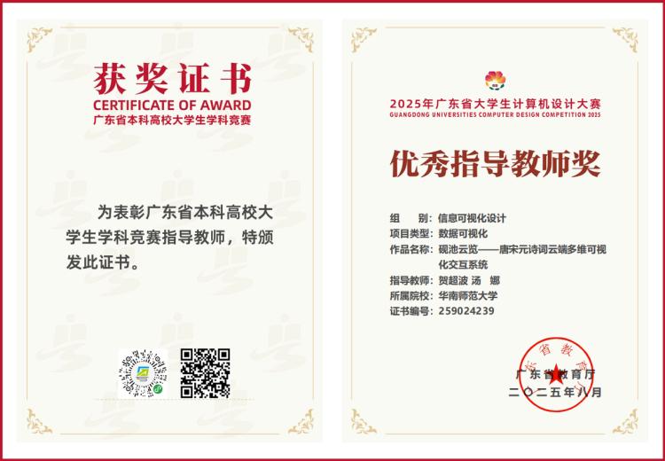近日,省教育廳正式頒發(fā)2025年省大學(xué)生計(jì)算機(jī)設(shè)計(jì)大賽優(yōu)秀指導(dǎo)教師獎,研究組賀超波老師連續(xù)3年獲得該獎項(xiàng)。大學(xué)生計(jì)算機(jī)設(shè)計(jì)大賽是省本科高校大學(xué)生學(xué)科競賽的重要賽事,每年舉辦一次,獲得一等獎的作品指導(dǎo)老師獲頒優(yōu)秀指導(dǎo)教師獎,證書由省教育廳頒發(fā)。