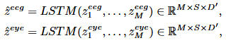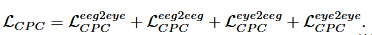 其中,D’是LSTM的隱藏層維度,且M+N≤T。將Zeeg和Zeye進(jìn)行拼接,以預(yù)測每個模態(tài)未來的N個時間步。使用InfoNCE損失函數(shù)來優(yōu)化該模塊,包括四部分損失:同模態(tài)下預(yù)測向量與真實向量的損失,異模態(tài)下預(yù)測向量與真實向量的損失。定義ZA和ZB為包含負(fù)樣本和一個正樣本的集合,A,B∈{eeg, eye}。那么: