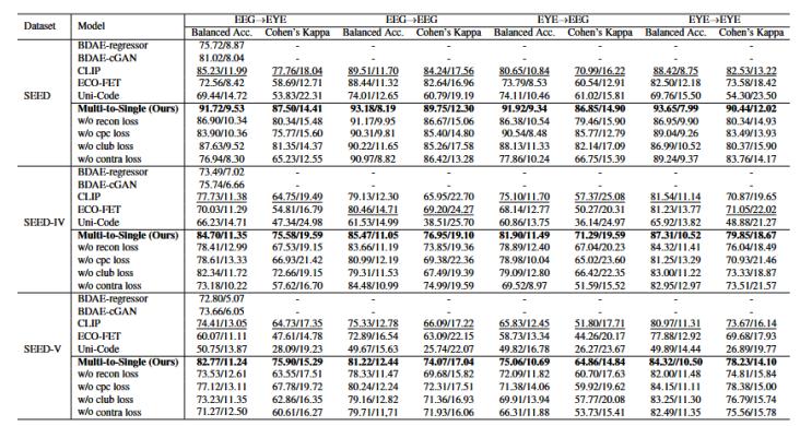表1 在 SEED、SEED-IV 和 SEED-V 數(shù)據(jù)集上,跨模態(tài)和單模態(tài)下的被試內(nèi)(subject-dependent)準(zhǔn)確率(%)和 Kappa 分?jǐn)?shù)(%)。其中,“EEG → EYE” 表示使用 EEG 數(shù)據(jù)進(jìn)行微調(diào),并使用 EYE數(shù)據(jù)進(jìn)行測試。