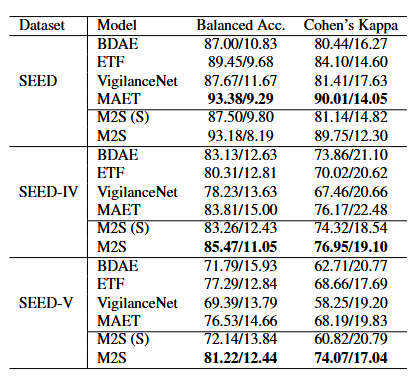 表3 多模態(tài)方法與 M2S 方法在 SEED、SEED-IV 和 SEED-V 數(shù)據(jù)集上的平衡準(zhǔn)確率(%)和 Kappa 分?jǐn)?shù)(%)比較。其中,(S) 表示該方法使用了相同的編碼器進(jìn)行單模態(tài)監(jiān)督學(xué)習(xí)。