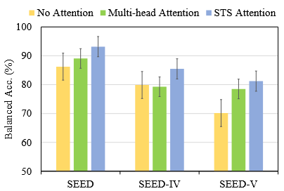 實驗結(jié)果如圖3所示,與不使用注意力或使用標(biāo)準(zhǔn)多頭注意力機制相比,采用STS注意力機制顯著提升了模型在EEG單模態(tài)任務(wù)上的性能。