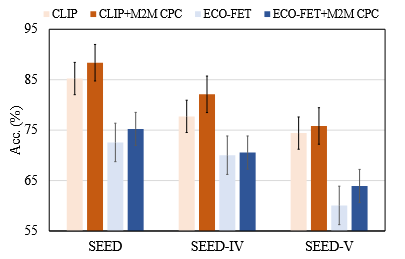 圖4 將 M2M CPC 模塊添加到 CLIP 和 ECO-FET 模型后,它們在 SEED、SEED-IV 和 SEED-V 數(shù)據(jù)集上的跨模態(tài)任務(wù) (EEG → EYE) 準(zhǔn)確率。