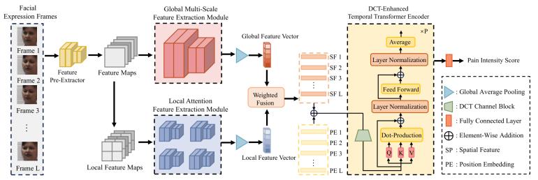 本研究設(shè)計(jì)的DLGSTT網(wǎng)絡(luò)開(kāi)創(chuàng)性地融合了三重特征提取機(jī)制:全局多尺度特征提取模塊(GM-FEM)捕獲面部表情的整體形態(tài)變化,局部注意力特征提取模塊(LAFEM)聚焦眼周、嘴角等關(guān)鍵區(qū)域的細(xì)微肌肉運(yùn)動(dòng),離散余弦變換增強(qiáng)的時(shí)間Transformer編碼器(DETTE)則精準(zhǔn)建模表情動(dòng)態(tài)演化的時(shí)序規(guī)律。該架構(gòu)有效解決了傳統(tǒng)方法在時(shí)空特征提取上的局限性,顯著提升了疼痛微表情的感知靈敏度。