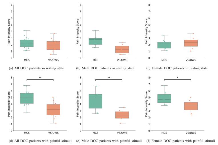 更具臨床價(jià)值的是,研究首次揭示了DOC患者中性別對(duì)疼痛感知閾值的影響:女性患者的疼痛感知閾值為3.2±0.8 N,顯著低于男性患者的4.5±1.1 N(p<0.01),且女性對(duì)中高強(qiáng)度疼痛的面部反應(yīng)幅度較男性高29.4%。這一發(fā)現(xiàn)為臨床制定性別特異性的意識(shí)評(píng)估標(biāo)準(zhǔn)提供了重要依據(jù)。