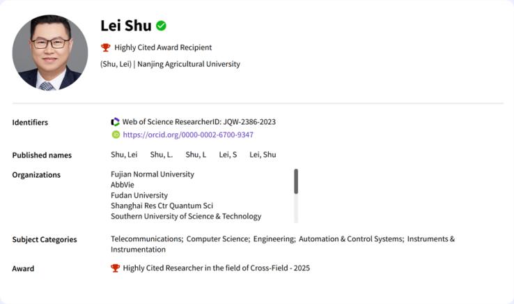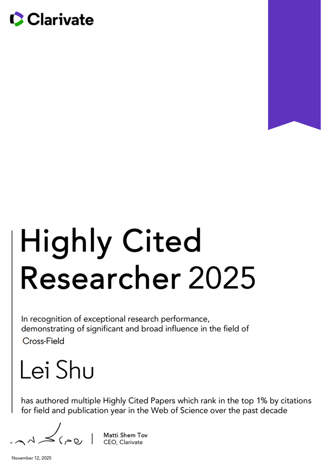 2025年11月12日,科睿唯安(Clarivate)發(fā)布了2025年度“全球高被引科學(xué)家(Highly Cited Researchers)”名單,舒磊教授入選該名單。名單中,舒磊教授的研究領(lǐng)域被歸入“交叉學(xué)科(Cross-Field)”。該學(xué)科全球共有3569人入選,中國(guó)有941人入選,占比26.4%。