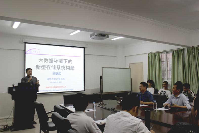 2018年11月16日,清華大學(xué)計算機系舒繼武教授應(yīng)邀在華南師范大學(xué)計算機學(xué)院做了“大數(shù)據(jù)環(huán)境下新型存儲系統(tǒng)構(gòu)建”學(xué)術(shù)報告。湯庸教授和黃昌勤教授分別主持了報告環(huán)節(jié)和互動環(huán)節(jié)。