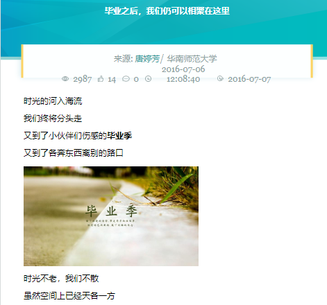 (4)延續(xù)畢業(yè)后友誼——2015級大家庭的學生可以在學者網(wǎng)團隊的班級交流平臺上延續(xù)她們的友誼與交流,可以形成強大的凝聚力和向心力。班級交流平臺對畢業(yè)生的影響是相當長遠的,再也不用擔心找不到老班長及其他同學了。該班級輔導員發(fā)的一條動態(tài):畢業(yè)之后,我們?nèi)钥梢韵嗑墼谶@里。