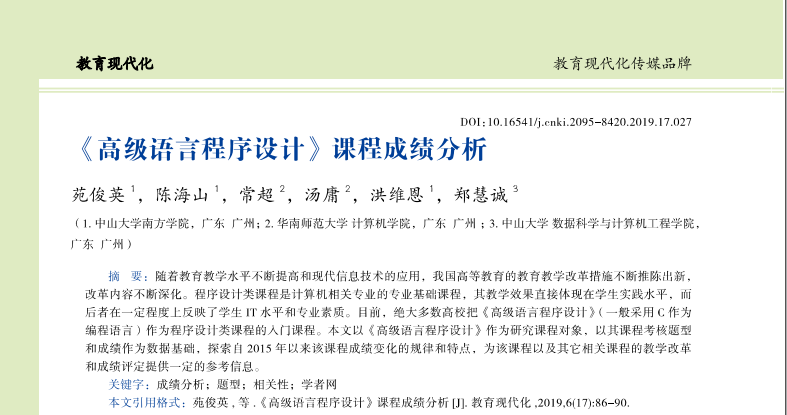 在課程平臺積累了大量的教學(xué)數(shù)據(jù)后,苑俊英、陳海山老師將這些數(shù)據(jù)收集處理,通過使用一些算法,研究學(xué)生在學(xué)習(xí)過程中的各項表現(xiàn),并將研究結(jié)果撰寫為論文——《高級語言程序設(shè)計》課程成績分析,2019年2月,論文正式發(fā)表于《教育現(xiàn)代化》。