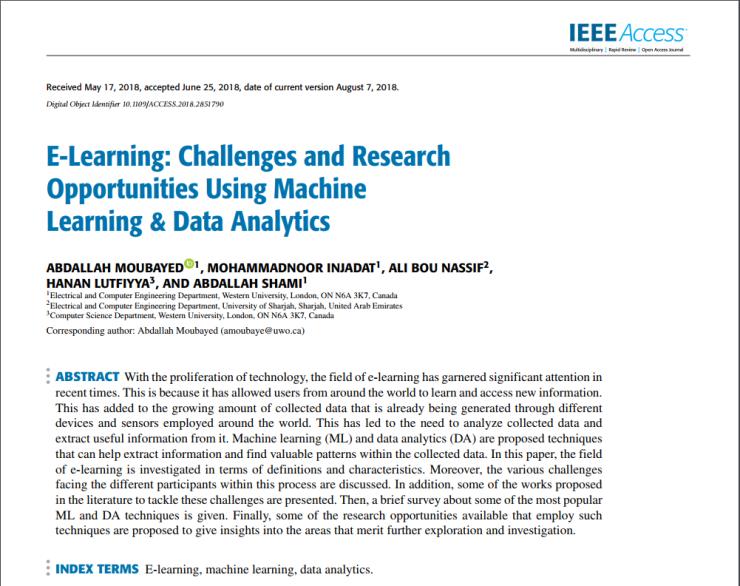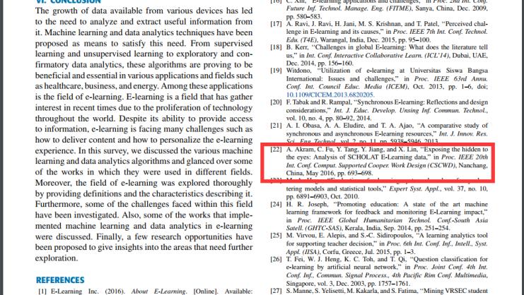 二區(qū) IEEE Access 文章E-Learning: Challenges and Research Opportunities Using Machine Learning & Data Analytics(作者為ABDALLAH MOUBAYED , MOHAMMADNOOR INJADAT, ALI BOU NASSIF, HANAN LUTFIYYA , AND ABDALLAH SHAMI,來(lái)自Western University和University of Sharjah等單位),正面引用SCHOLAT學(xué)者網(wǎng)課程案例,被引用的為團(tuán)隊(duì)發(fā)表在CCF推薦會(huì)議CSCWD 2016的學(xué)術(shù)論文Exposing the Hidden to the Eyes: Analysis of SCHOLAT E-Learning Data(作者為Aftab Akram,Chengzhou Fu, Yong Tang*, Yuncheng Jiang and Xueqin Lin等)。