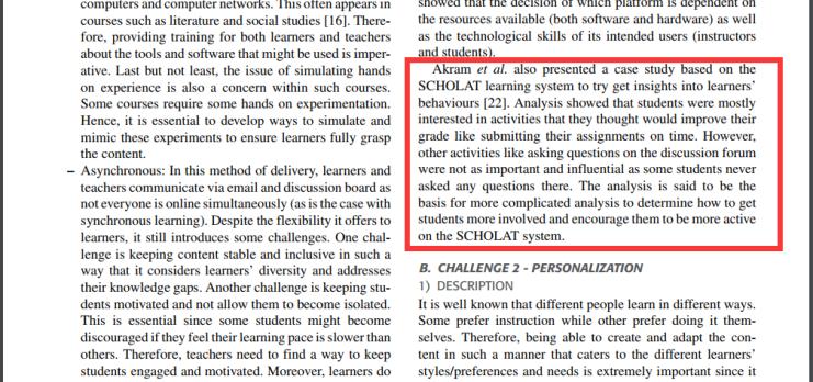 引用正文描述:Akram et al. also presented a case study based on the SCHOLAT learning system to try get insights into learners’ behaviours [22]. Analysis showed that students were mostly interested in activities that they thought would improve their grade like submitting their assignments on time. However, other activities like asking questions on the discussion forum were not as important and influential as some students never asked any questions there. The analysis is said to be the basis for more complicated analysis to determine how to get students more involved and encourage them to be more active on the SCHOLAT system.