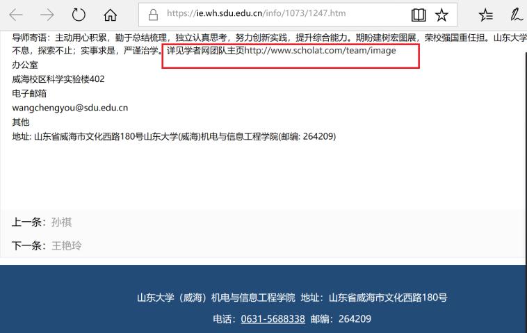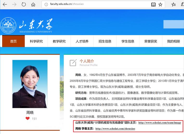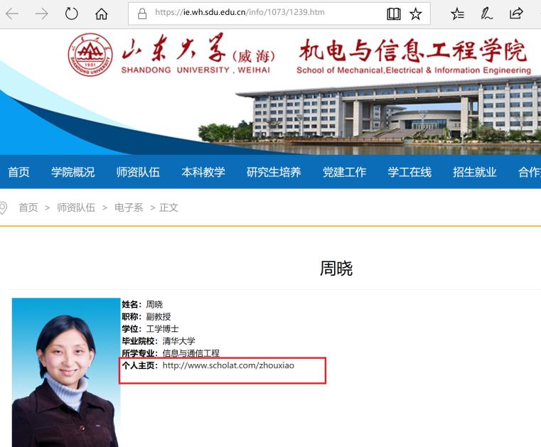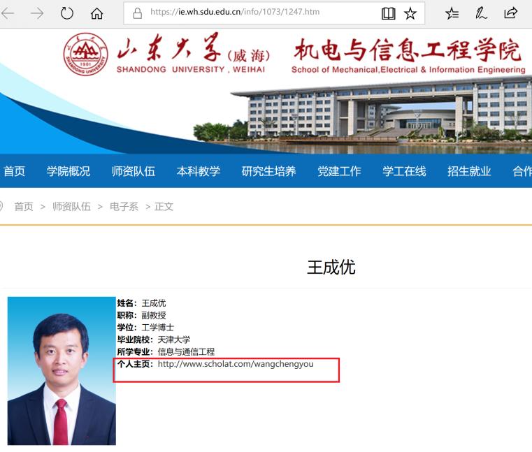 此外,山東大學(xué)(威海)機(jī)電與信息工程學(xué)院網(wǎng)站“師資隊(duì)伍”欄目電子系教師介紹:王成優(yōu)副教授和周曉副教授個(gè)人介紹頁(yè)面中也加了鏈接指引到學(xué)者網(wǎng)個(gè)人主頁(yè)。