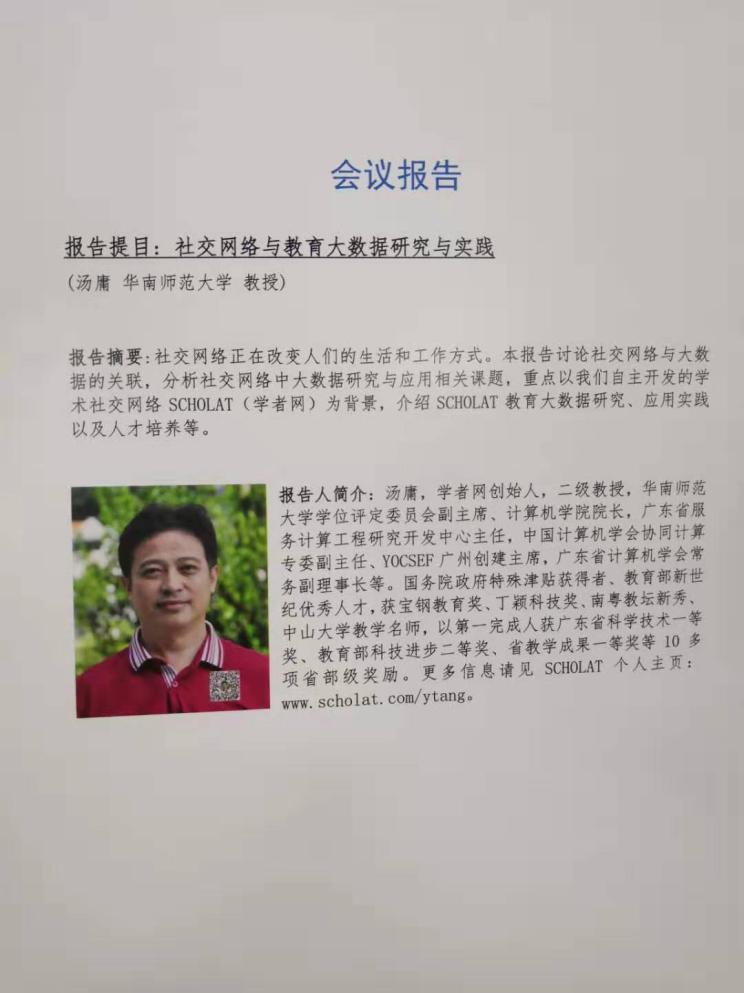 至今,湯庸教授已應(yīng)邀在70多所高校(包括22所985高校,2個(gè)中國科學(xué)院大學(xué)研究機(jī)構(gòu)、3所國外境外高校)匯報(bào)SCHOLAT及大數(shù)據(jù)研究與應(yīng)用進(jìn)展,還在幾十個(gè)國際學(xué)術(shù)會(huì)議、國內(nèi)學(xué)術(shù)會(huì)議及論壇做大會(huì)報(bào)告和主題報(bào)告。