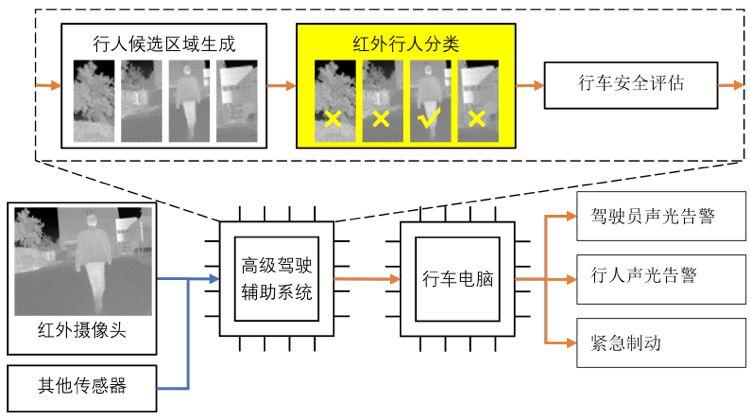 行人分類研究在計(jì)算機(jī)視覺領(lǐng)域具有重要的理論研究意義及應(yīng)用價(jià)值。由于遠(yuǎn)紅外圖像相對(duì)于可見光圖像來(lái)講,有著不受天氣、光照因素影響的獨(dú)特優(yōu)勢(shì),因此受到了相關(guān)學(xué)者的廣泛關(guān)注。紅外行人分類可以為駕駛輔助系統(tǒng)提供關(guān)鍵技術(shù)支撐,圖1給出了駕駛輔助系統(tǒng)的結(jié)構(gòu)圖。從圖中可發(fā)現(xiàn),行人分類結(jié)果是行車安全評(píng)估的重要依據(jù),在實(shí)際應(yīng)用中行人分類錯(cuò)誤可能會(huì)導(dǎo)致嚴(yán)重的交通事故。