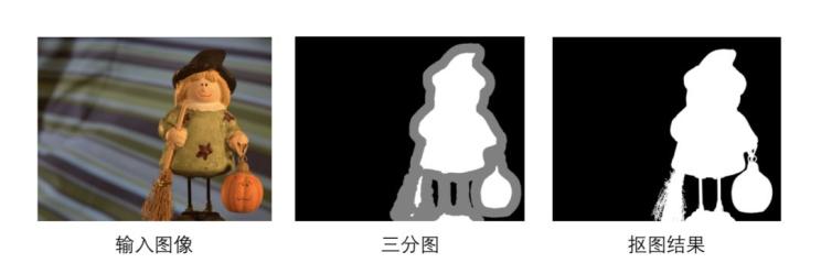 圖3展示了一個(gè)自然圖像摳圖效果的示例圖,在自然圖像摳圖技術(shù)中三分圖給出了部分的前景區(qū)域(白色部分)與部分的背景區(qū)域(黑色部分),指定了用戶想要“摳”的區(qū)域以及不感興趣的區(qū)域。然而目前流行的摳圖算法中三分圖的生成依賴人工輔助,需通過(guò)一次或多次的用戶交互生成,因此嚴(yán)重限制了摳圖在圖像分類等自動(dòng)化場(chǎng)景中的應(yīng)用。