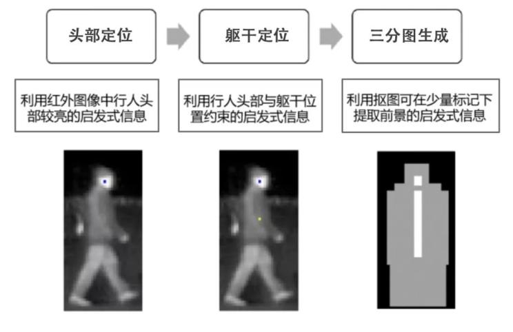 為了克服摳圖中三分圖生成依賴人工的問(wèn)題,本文提出了紅外行人三分圖自動(dòng)生成算法。該算法假設(shè)輸入的圖像中包含行人,利用行人在紅外圖像中成像特點(diǎn)估計(jì)行人的頭部區(qū)域以及軀干位置,并依據(jù)兩者的位置生成三分圖。紅外行人三分圖自動(dòng)生成算法的基本流程如圖4所示。