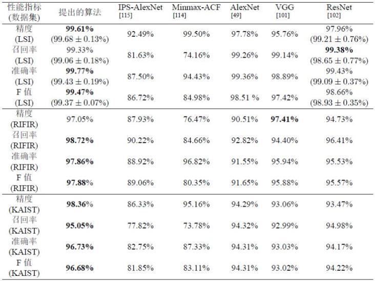 表1 基于自動(dòng)摳圖增強(qiáng)的紅外行人分類算法在LSI、RIFIR 以及KAIST 數(shù)據(jù)集上與5 個(gè)現(xiàn)有的紅外行人分類算法的分類性能定量比較