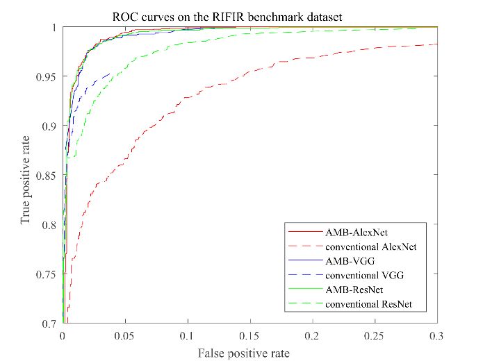 (b)在RIFIR數(shù)據(jù)集上獲得的ROC 曲線對(duì)比