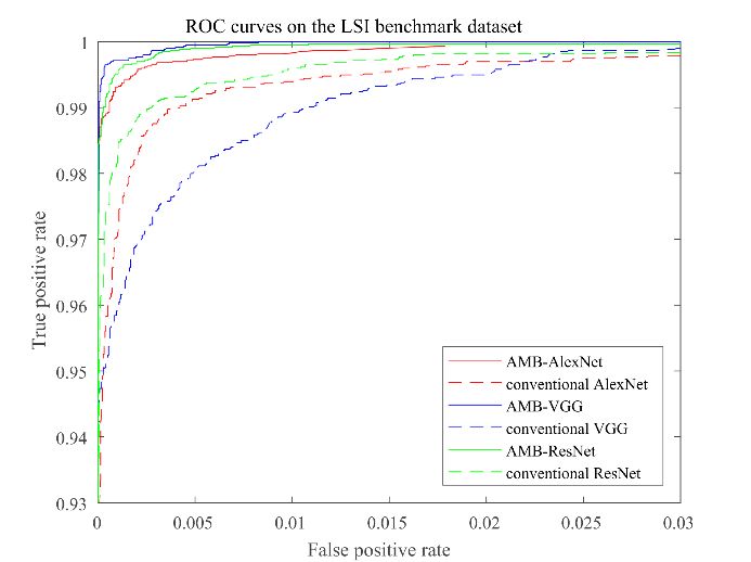 圖6 基于自動(dòng)摳圖的紅外行人預(yù)處理的深度學(xué)習(xí)分類算法以及流行的深度學(xué)習(xí)分類算法在三個(gè)測(cè)試集上ROC 曲線對(duì)比