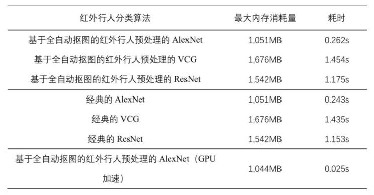 表2 基于自動(dòng)摳圖的紅外行人預(yù)處理的深度學(xué)習(xí)分類算法以及經(jīng)典的深度學(xué)習(xí)分類算法計(jì)算耗時(shí)及最大內(nèi)存消耗量對(duì)比