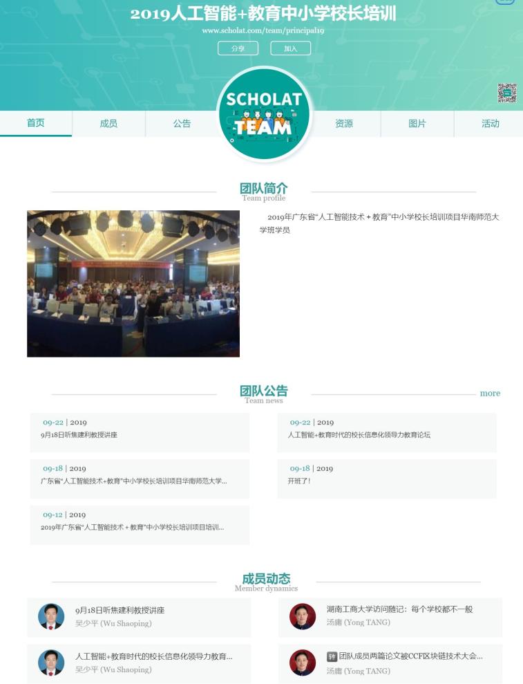 學者網(wǎng)作為學者社交網(wǎng)站,提供“團隊”功能,為此次培訓(xùn)項目提供網(wǎng)絡(luò)在線支持,創(chuàng)建<2019人工智能+教育中小學校長培訓(xùn)>團隊,在線分享資源、通知公告、提供信息發(fā)布門戶、在線交流平臺等。