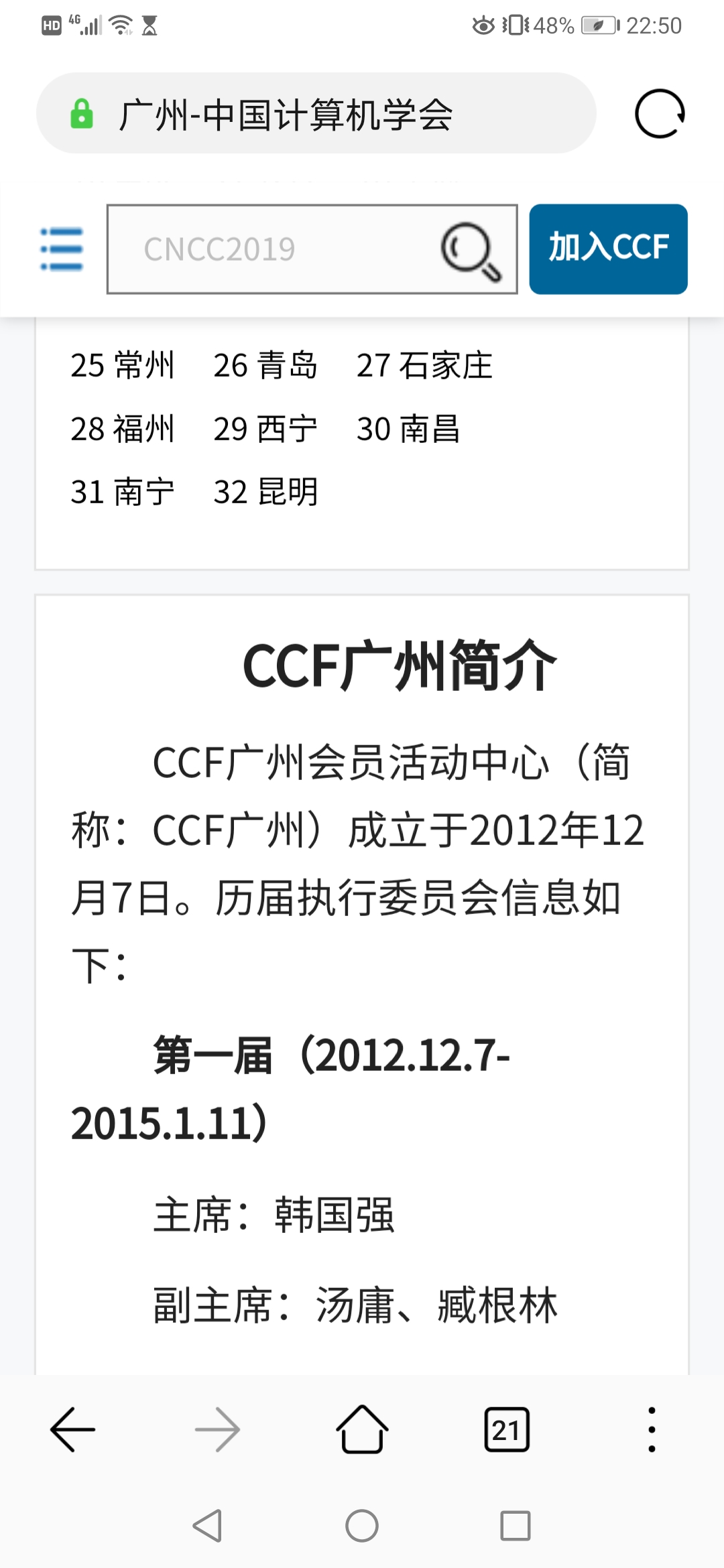 2015年換屆會議再次由華南師范大學湯庸教授負責承辦,杜子德再次親臨華師計算機學院參加會議,臧根林任主席,湯庸繼續(xù)擔任委員至今。2019年許勇成為第三位主席,CCF廣州被評為2019年優(yōu)秀分部第一名。