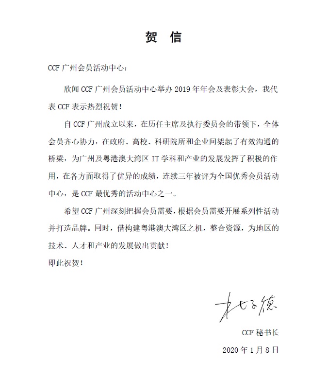 CCF廣州分部2017-2019年連續(xù)三年被評(píng)為全國(guó)優(yōu)秀分部,據(jù)悉本次年會(huì)是CCF廣州分部第一次舉辦年會(huì),CCF秘書長(zhǎng)杜子德專門發(fā)來(lái)賀信,信中高度肯定CCF廣州近年取得的成績(jī),評(píng)價(jià)CCF廣州分部是CCF最優(yōu)秀會(huì)員活動(dòng)中心之一。子德秘書長(zhǎng)的賀信,對(duì)CCF廣州分部是鼓勵(lì)也是鞭策,CCF廣州許勇主席表示:我們將繼續(xù)努力,開(kāi)拓進(jìn)取,只爭(zhēng)朝夕,不負(fù)韶華。(圖:王治國(guó) 文:黃棟 統(tǒng)籌:黃書強(qiáng))