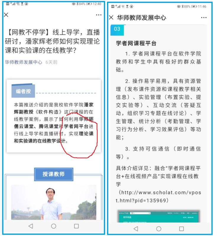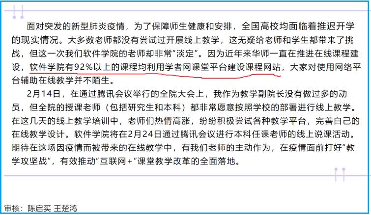 在2月21日華南師范大學(xué)教師發(fā)展中心組織的”網(wǎng)教不停學(xué),線上導(dǎo)學(xué),直播研討"活動(dòng)上,主講人軟件學(xué)院副院長(zhǎng)潘家輝推介學(xué)者網(wǎng)課程平臺(tái)時(shí)說“面對(duì)突發(fā)的新型肺炎疫情,...這一次我們軟件學(xué)院的老師卻非?!ā?..,軟件學(xué)院有92%以上的課程均利用學(xué)者網(wǎng)課堂平臺(tái)建設(shè)課程網(wǎng)站,大家對(duì)使用網(wǎng)絡(luò)平臺(tái)輔助在線教學(xué)并不陌生。"(https://mp.weixin.qq.com/s/fjk0S_uxc4i7VLA5PtCGK)